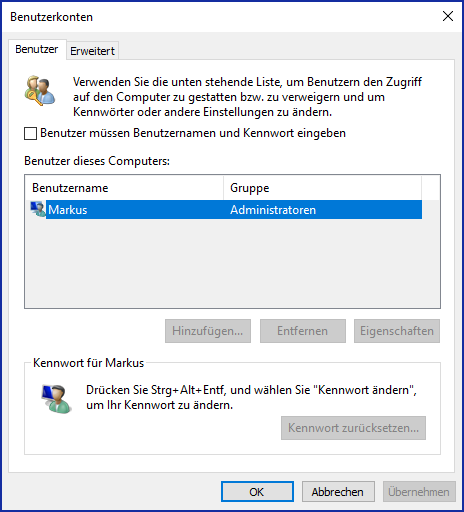 Mit der Tastenkombination Windowstaste +R wird das Ausführen-Fenster geöffnet in dem der Befehl netplwiz eingegeben wird.