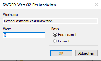 Im Verzeichnis „HKEY_LOCAL_MACHINE\SOFTWARE\Microsoft\Windows NT\CurrentVersion\PasswordLess\Device“ wird auf der rechten Seite der Eintrag „DevicePasswordLessBuildVersion“ mit einem Doppelklick geöffnet und der Wert von 2 auf 0 geändert. Anschließend kann der Autologin nach der obigen Beschreibung eingestellt werden.