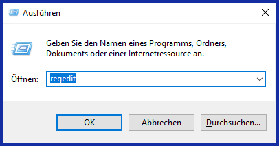 Dazu drücken wir noch einmal die Windowstaste+R und geben in das Feld regedit ein